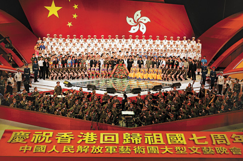 中新網(wǎng)6月24日電 據(jù)香港大公報(bào)報(bào)道,中國人民解放軍藝術(shù)團(tuán)昨晚在香港紅磡體育館舉行“慶祝香港回歸七周年大型文藝晚會(huì)”首場演出。特區(qū)行政長官董建華、中央駐港聯(lián)絡(luò)辦主任高祀仁,副主任李剛,外交部駐港特派員楊文昌、解放軍駐港部隊(duì)司令員王繼堂、政委王玉發(fā),特區(qū)律政司司長梁愛詩等出席觀看了晚會(huì)。