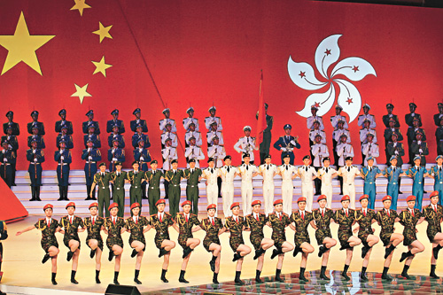 在“香港你好”一章中,藝術(shù)團(tuán)還特別演唱了“獅子山下”、“東方之珠”等反映香港市民生活和自強(qiáng)不息的歌曲!皵y手踏平崎嶇……用艱辛努力寫下那不朽香江名句”,市民熟悉的歌詞在場內(nèi)回旋,這是香港人的心聲,也是藝術(shù)團(tuán)對(duì)香港的美好祝愿,數(shù)千名觀眾以如潮的掌聲熱烈回應(yīng)藝術(shù)家們的深情祝福。