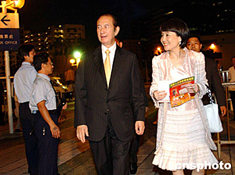 為慶祝香港回歸祖國七周年,中國人民解放軍400人的藝術(shù)團(tuán)6月23日在香港紅磡體育館舉行盛大演出。圖為“賭王”何鴻燊攜姨太梁安琪觀看晚會(huì)。作者:洪少葵
