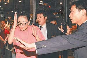 王菲和其助理、孫楠、李亞鵬乘林肯車回酒店,計劃由孫楠充當(dāng)攝影記者的擋箭牌,分散注意力,保護(hù)二位順利上樓?墒且饬现獾氖牵诰频觊T外,十多位王菲的歌迷,苦等了一夜,依舊站在那里不停地呼喊,氣勢不減;還有,記者的兩臺車始終分隔在林肯轎車的前后,原本要躲避影迷從酒店員工通道進(jìn)入的林肯轎車不得不兜了一大圈后,?吭诰频暾T。歌迷瘋狂到了極點,孫楠根本無法引開火力,緊要關(guān)頭,一向低調(diào)的王菲親自掩護(hù)起李亞鵬來。