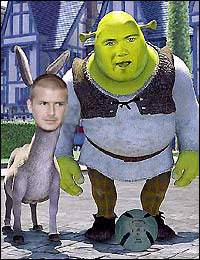 圖1則把貝克漢姆設(shè)計為了《怪物史萊克》中那只喋喋不休的驢子,而本屆歐錦賽上表現(xiàn)出色的小將魯尼則成為了史萊克。