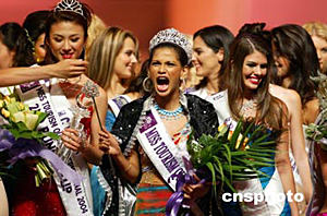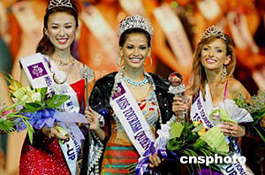6月29日,令人矚目的2004國際旅游小姐冠軍總決賽在浙江杭州落下帷幕。印度選手ZABINA ABDUL RASHID KHAN,(中)從來自51個國家的53位旅游形象大使中脫穎而出獲得冠軍。德國選手JOHNALENA KWASOW獲得亞軍,中國選手鈔俊男(左)也發(fā)揮了較好的水平,在強(qiáng)手如林的競爭中獲得第三名。作者:饒強(qiáng)
