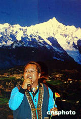 七月四日晚,參加情系香格里拉——兩岸文化聯(lián)誼行活動的兩岸四地文化界人士在香格里拉與迪慶州文藝界人士歡聚一堂,交流文化,增進友誼。圖為來自臺灣原住民文化推廣協(xié)會理事長麥村連先生登臺演唱。中新社記者:武仲林