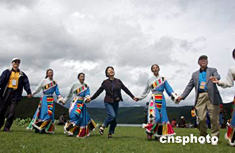 七月四日,參加情系香格里拉——兩岸文化聯(lián)誼行活動的兩岸四地文化界人士來到美麗的云南香格里拉屬都湖,體驗藏族鍋莊舞的自然、豪放。中新社記者:武仲林