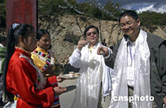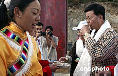 七月五日,參加情系香格里拉——兩岸文化聯(lián)誼行活動的兩岸四地文化界人士來到德欽,受到當(dāng)?shù)夭刈逋臒崃覛g迎。圖為臺灣金門縣縣長李炷烽先生品嘗藏族姑娘敬獻的青稞酒。中新社記者:武仲林