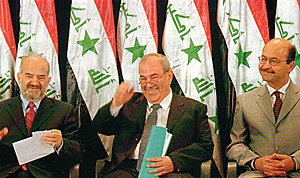 代表伊拉克新政府的權(quán)力的,主要是三個方面:總統(tǒng)、部長會議和國民議會。伊拉克的總統(tǒng)很大程度是一個象征性的職位。不過,部長會議發(fā)布的法令在成為法律之前,必須得到總統(tǒng)和兩個副總統(tǒng)的一致同意。