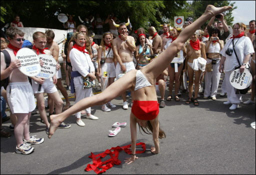示威者們指出,為了吸引成千上萬的游客,潘普洛納每年都?xì)埲痰貙Υ笈,并在斗牛前對公牛進(jìn)行針刺、鞭打等各種折磨以令其害怕,而這些虐待動(dòng)物的行為都是應(yīng)該被制止的。
