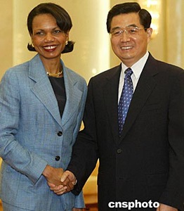 中國(guó)國(guó)家主席胡錦濤,七月九日在北京會(huì)見美國(guó)總統(tǒng)國(guó)家安全事務(wù)助理康多莉扎·賴斯。中新社記者:鄭萍萍
