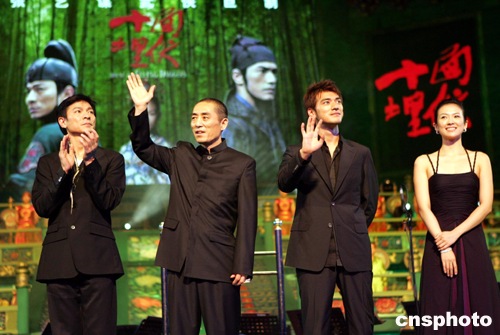 七月十日晚,影片《十面埋伏》在北京舉行盛大的全球首映慶典,影片主要創(chuàng)作人員劉德華、張藝謀、金城武、章子怡(從左到右)盛裝出席。作者:高遠
