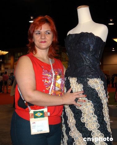 二○○四年七月,第十五屆艾滋病大會展出的巴西藝術(shù)工作者愛德羅娜·波特尼用安全套制作十八套時裝,其中有八套已被高價購買。圖為愛德羅娜與自己的得意之作。中新社記者:曾利明