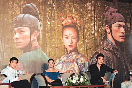 中新網(wǎng)7月15日電 據(jù)香港大公報(bào)報(bào)道,因母親在北京做心臟手術(shù)而未能出席《十面埋伏》香港首映禮的章子怡,終趕及到臺(tái)北為該片宣傳。在昨午的記者會(huì)上,與男主角金城武、劉德華和導(dǎo)演張藝謀一起,暢談拍片花絮,晚間則出席在故宮博物院舉行的首映會(huì)。