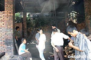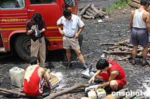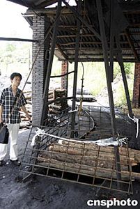 十四日七時,湖南湘潭雙扶煤礦系統(tǒng)進行提升時,因電纜折斷,造成電纜短路起火,導致井筒木支架起火燃燒,使當時正在井下作業(yè)的九十五人被困,F(xiàn)已確認有六人死亡,還有三人被困井下,下落不明。圖為發(fā)生礦難的井口。作者:白祖偕
