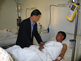 孫大使沉著指揮,夜以繼日,以身作則。龐春雪主任胃痛發(fā)暈,吃幾片藥又坐在辦公桌前。談天累得發(fā)高燒仍堅(jiān)持工作。郭徽在回家洗去6天的塵土后馬上又投入戰(zhàn)斗。馬斗弛至今仍戰(zhàn)斗在昆都士第一線。剛到使館工作的趙坤為確保我傷者得到最好的治療,常常在醫(yī)院工作到深夜才冒著危險(xiǎn)獨(dú)自駕車返回使館……