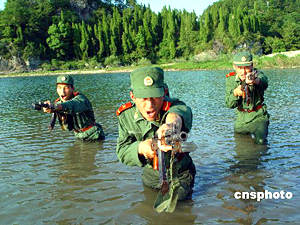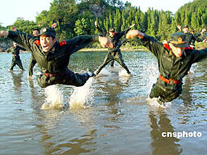 7月18日,浙江省仙居縣武警官兵頂著烈日,冒著酷暑進(jìn)行水上高難項目訓(xùn)練。為適應(yīng)水上戰(zhàn)斗能力,仙居縣武警官兵頂著烈日,開始進(jìn)行為期15天的水上訓(xùn)練。華文武 攝