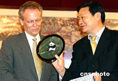 湖南省常務副省長于幼軍七月十九日會見了美國愛普斯頓公司國際公司董事長麥克·大漠先生一行。麥克表示,愛普斯頓公司已決定在長沙設立中國中部第一家辦事處,并有意介入湖南的項目開發(fā)。圖為于幼軍將一幅傳統(tǒng)手工藝品湘繡贈與麥克先生。作者:白祖偕