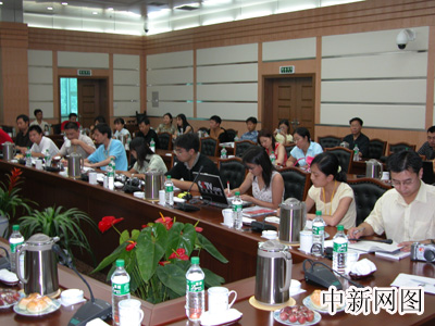 第二屆“網(wǎng)上河北行”采風(fēng)團(tuán)的記者們21日來到唐山市采訪,唐山市政府領(lǐng)導(dǎo)召開市情說明會(huì)向記者介紹了唐山現(xiàn)狀。圖為說明會(huì)現(xiàn)場。(秦欣攝)