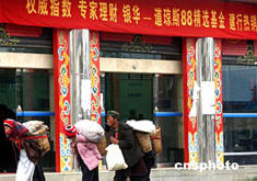 據(jù)最新統(tǒng)計(jì)數(shù)據(jù)顯示:截至二○○四年七月二十日,中國(guó)內(nèi)地證券投資基金的凈值已經(jīng)達(dá)到三千零一點(diǎn)九二億元,約占A股流通市值的四分之一。而在二○○三年九月,基金凈值占兩市A股流通總市值的比例只有百分之十三點(diǎn)五。圖為七月,云南香格里拉的幾位居民經(jīng)過(guò)一家懸掛著基金銷售橫幅的銀行。中新社記者:武仲林