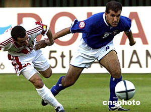 中新社濟(jì)南七月二十三日電(記者高凱)亞洲杯B組第二輪首場(chǎng)比賽今晚在濟(jì)南體育中心進(jìn)行。約旦隊(duì)在補(bǔ)時(shí)階段連中兩元,以二比零戰(zhàn)勝科威特隊(duì)。