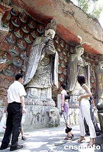 二○○四年七月下旬,游客在世界著名文化遺產(chǎn)重慶大足石刻參觀華嚴(yán)三圣中的文殊菩薩(左)和大日如來像。文殊菩薩手托重達(dá)千斤寶塔,歷時(shí)八百余年而不墜,體現(xiàn)了中國(guó)古代工匠對(duì)力學(xué)的精巧應(yīng)用。中新社記者:毛建軍