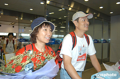 七月二十六日下午,代表全球華人參加二零零四雅典奧運(yùn)圣火希臘本土傳遞的孫雯和濮存昕結(jié)束了華人火炬手的首次奧運(yùn)圣火之旅返抵北京國際機(jī)場。兩人與成龍作為中國火炬手于七月二十四日參加了希臘本土的奧運(yùn)圣火傳遞。作者:徐曦弋