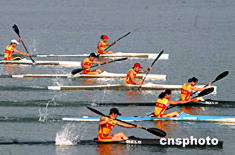 中國國家皮劃艇隊女子皮艇運動員七月二十七日在山東日照水庫訓(xùn)練基地進行奧運賽前模擬實戰(zhàn)訓(xùn)練,備戰(zhàn)雅典奧運會。作者:張勤