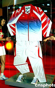 七月二十七日,李寧公司贊助第二十八屆奧運(yùn)會(huì)中國代表團(tuán)新聞發(fā)布會(huì)在北京舉行,李寧公司正式推出以“錦繡中華”領(lǐng)獎(jiǎng)服和“極光”領(lǐng)獎(jiǎng)鞋為主的領(lǐng)獎(jiǎng)裝備。中新社記者:鄭萍萍