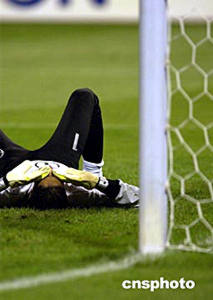 7月27日晚,亞洲杯B組科威特隊、韓國隊生死爭奪戰(zhàn)在濟南山東省體育中心舉行,最終科威特以0比4負于韓國隊,無緣八強。圖為四度被洞穿球門的科威特門將懊惱不已。中新社記者:武仲林