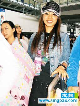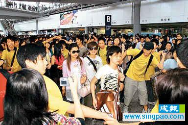昨午機(jī)場(chǎng)擠滿(mǎn)各個(gè)歌手的歌迷,當(dāng)中以S.H.E的Fans數(shù)目最多兼最有組織性。S.H.E的Fans為數(shù)過(guò)百人,其歌迷會(huì)更自發(fā)組成保安隊(duì),在S.H.E踏出機(jī)場(chǎng)時(shí),約廿名歌迷會(huì)成員組成的保安隊(duì)已一涌而上,沖進(jìn)禁區(qū)并筑起人墻保護(hù)偶像。