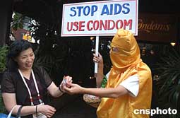 泰國(guó)預(yù)防艾滋病教育已經(jīng)融入當(dāng)?shù)厣鐣?huì)生活,性安全、性健康的觀念開(kāi)始逐漸成為民眾的自覺(jué)意識(shí)。座落在曼谷市區(qū)最繁華的蘇孔特威路的曼谷“小白菜安全套餐廳”是泰國(guó)人口與社區(qū)發(fā)展協(xié)會(huì)主席米猜先生創(chuàng)辦的。每逢節(jié)假日,餐廳門口還會(huì)有一名扮成安全套卡通人物的店員,手擎著“預(yù)防艾滋病,請(qǐng)用安全套”的標(biāo)語(yǔ)牌,向每一位就餐者熱情地奉上一個(gè)安全套。中新社記者:曾利明
