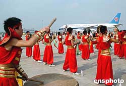 廣州新白云國(guó)際機(jī)場(chǎng)遷建落成慶典二○○四年八月二日在新機(jī)場(chǎng)停機(jī)坪舉行。一架空中客車在新機(jī)場(chǎng)降落并停在慶典會(huì)場(chǎng),一百二十名新機(jī)場(chǎng)的建設(shè)者手棒鮮花走下飛機(jī)走向會(huì)場(chǎng)參加落成慶典。作者:羅仰明