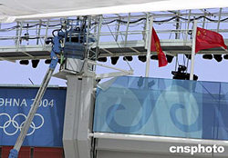 當(dāng)?shù)貢r間8月2日中午,驕陽映照正在緊張排練奧運(yùn)會開幕式的希臘雅典奧運(yùn)會主會場。國際奧委會所有會員的旗幟在體育場四周依次排列,鮮艷的中國國旗在體育場西南方向迎風(fēng)飄揚(yáng)。中新社記者:任晨鳴