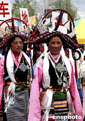 今夏西藏江孜地區(qū)農(nóng)民在盛大民間傳統(tǒng)活動中展示當?shù)夭刈宸。中國藏區(qū)地域廣泛,藏族服飾十分豐富,然變化最大的在于他們的頭飾。中新社記者:王麗南