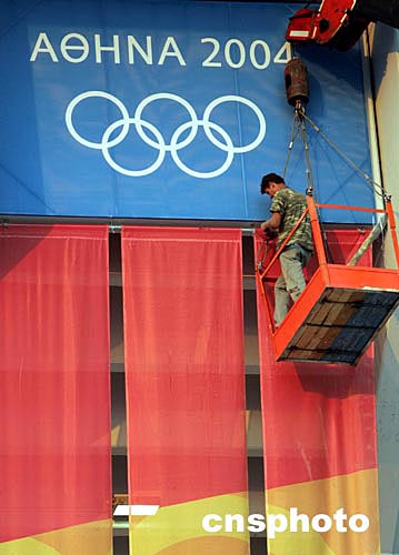 當(dāng)?shù)貢r(shí)間8月3日晚,一名建筑工人在雅典奧運(yùn)會(huì)主體育場(chǎng)安裝加固旗幟,開幕式將于8月13日在這里舉行。中新社記者:任晨鳴