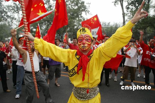 8月7日晚八時,2004年亞洲杯足球賽決賽中國隊與日本隊的比賽將在北京工人體育場舉行,各地球迷提前到達北京工人體育場為中國隊加油。圖為北京工人體育場外為中國隊加油的球迷。