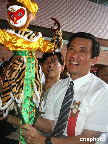 臺(tái)北偶戲館八月七日開(kāi)張。圖為臺(tái)北市長(zhǎng)馬英九手持一個(gè)孫悟空造型的戲偶出席開(kāi)幕式。作者:董會(huì)峰