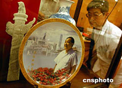 8月8日,由鄧小平夫人、88歲高齡的卓琳親筆題字“永遠(yuǎn)的懷念”的鄧小平紀(jì)念瓷,在剛開業(yè)的北京保利至尊寶禮畫廊首發(fā),紀(jì)念瓷限量發(fā)行2004套,每套四件,包括:“世紀(jì)偉人鄧小平”高檔新彩瓷盤像、“品德風(fēng)范萬(wàn)年青”青花斗彩松鶴瓶、“東方風(fēng)來(lái)滿園春”彩繪花卉圓盤、“三陽(yáng)開泰映神州”雙龍高溫顏色釉月光瓶。中新社記者:張宇