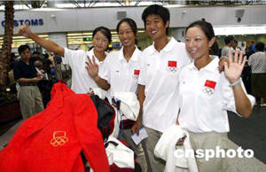 中國網(wǎng)球隊原本一直默默無聞,但是今年中國女將取得了一個單打和兩個雙打的雅典奧運會參賽資格,加上此前鄭潔在法網(wǎng)的出色表現(xiàn),都令這一項目的受關(guān)注度直線上升。今天鄭潔、晏紫、李婷和孫甜甜四名女將身著統(tǒng)一的白色T裇出現(xiàn)在機(jī)場,她們的燦爛表情不知“謀殺”了多少記者的膠卷。