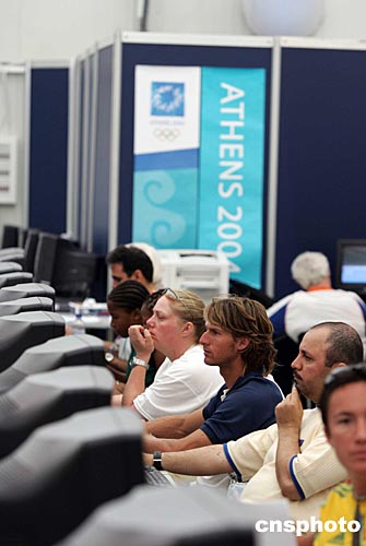 當(dāng)?shù)貢r(shí)間八月八日,參加雅典奧運(yùn)會(huì)的選手上網(wǎng)娛樂。中新社記者:毛建軍
