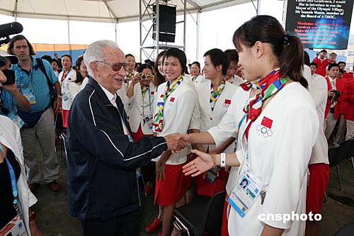 薩馬蘭奇與中國游泳隊員握手交談。當?shù)貢r間八月九日上午,參加雅典奧運會的中國體育代表團在雅典奧運選手村舉行升旗儀式時,國際奧委會主席薩馬蘭奇專程前來看望代表團成員。中新社記者:毛建軍