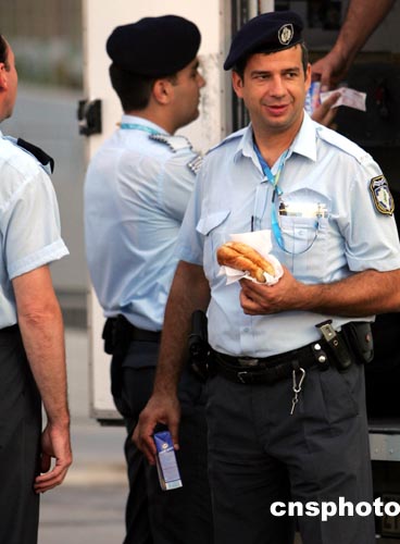 當?shù)貢r間八月九日中午,幾名參與雅典奧運會安保的希臘警察依次領取簡易的工作午餐。中新社記者:任晨鳴