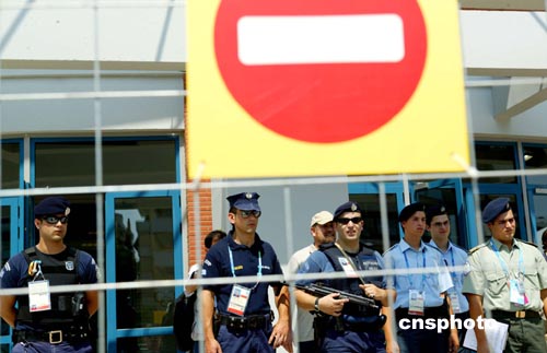 當(dāng)?shù)貢r(shí)間八月九日在希臘雅典奧運(yùn)會(huì)主新聞中心前,全副武裝的軍警一步一崗,以確保各國(guó)記者安全。中新社記者:王瑤