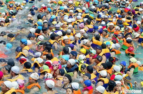 中新網8月11日電 據法新社消息,2004年8月0日,韓國迎來了10年來的最高氣溫35攝氏度,人們紛紛前來游樂園中的游泳池避暑,造成這里人滿為患的景象。(固山)