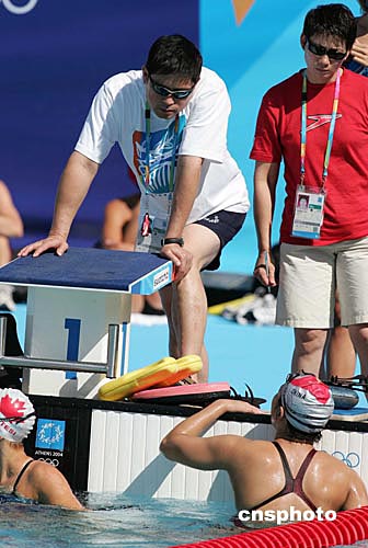 當(dāng)?shù)貢r間八月十一日上午,中國游泳隊教頭趙戈在雅典奧運比賽場指導(dǎo)隊員進(jìn)行熱身訓(xùn)練。中新社記者:毛建軍