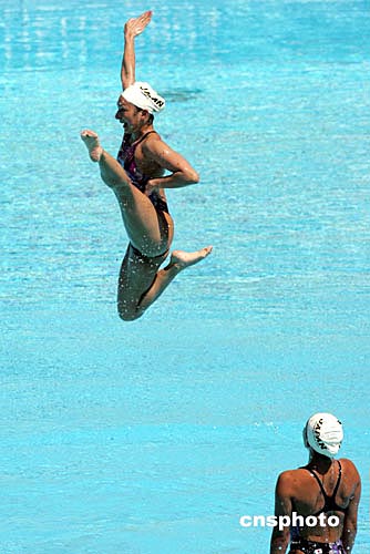 當(dāng)?shù)貢r(shí)間八月十一日上午,日本花樣游泳選手在雅典奧運(yùn)比賽場(chǎng)進(jìn)行熱身訓(xùn)練,動(dòng)作奇特。中新社記者:毛建軍