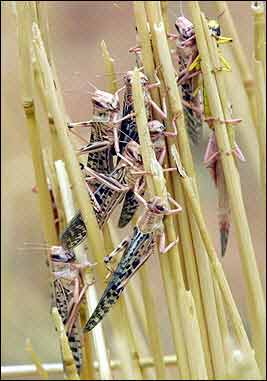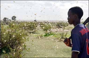 目前這一地區(qū)現(xiàn)在面臨著15年來最為嚴重的一次蝗災(zāi),大批的沙漠蝗蟲正從西北非侵襲毛利塔尼亞,馬里以及尼日利亞,在這一地區(qū),很多都是依靠農(nóng)業(yè)生活的人。蝗災(zāi)爆發(fā)時,一群群的蝗蟲鋪天蓋地,烏云蔽日般東奔西撞,它們所到之處,各種綠色植物均遭暴殄,慘不忍睹。1988年,非洲的塞內(nèi)加爾和毛里塔尼亞境內(nèi),發(fā)生了數(shù)十年罕見的蝗災(zāi),僅一群蝗蟲就可達1000億只以上。