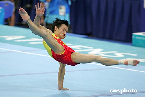 中國男子體操隊于當(dāng)?shù)貢r間八月十一日晚在雅典奧運體操比賽館與德國、日本、烏克蘭隊進行集體合練,圖為楊威在自由體操訓(xùn)練中。中新社記者:毛建軍