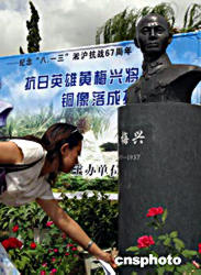 上海市黃埔軍校同學會等八月十二日在上海舉行紀念“八·一三”淞滬抗戰(zhàn)暨黃梅興將軍銅像揭幕儀式。黃將軍是“八·一三”淞滬抗戰(zhàn)中殉國的第一位中國軍隊將領。作者:潘索菲