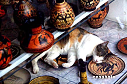 奧運開幕在即,盡管外界氣氛緊張,一只家貓在雅典的工藝品商店櫥窗里酣然入睡。中新社記者:王瑤
