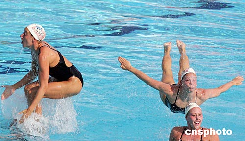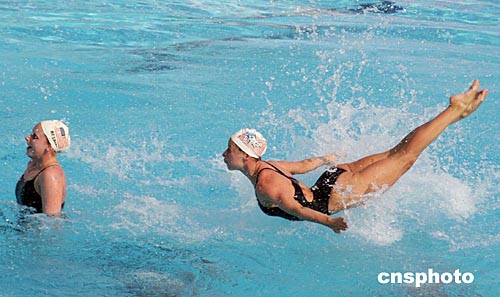 美國女子花樣游泳隊當?shù)貢r間八月十二日下午在雅典奧運花樣游泳比賽場進行賽前訓練,動作新穎,造型別致。