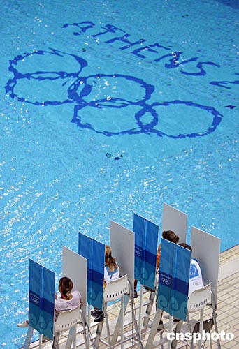 雅典奧運跳水比賽館當?shù)貢r間八月十二日試驗電子打分系統(tǒng),裁判當場打分時將用擋板隔開進行獨立操作。中新社記者:毛建軍